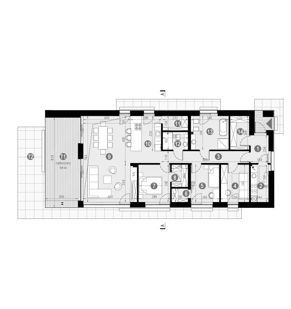 Strefa wejściowa została starannie zaplanowana – zadaszone wejście chroni przed deszczem i śniegiem, a przestronny wiatrołap mieści ponad 5 m² garderoby na ubrania i obuwie. Obok znajduje się kotłownia z funkcją pralni i dodatkowym miejscem do przechowywania – idealna jako zaplecze gospodarcze domu.
