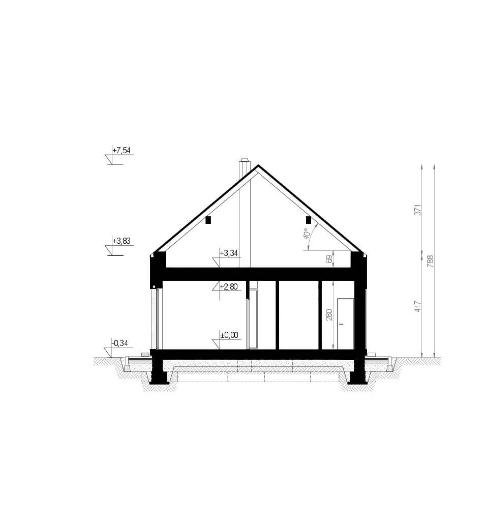 Projekt cechuje się nowoczesnym podejściem do formy – klasyczny dwuspadowy dach zestawiono z prostą, zwartą bryłą, dzięki czemu dom doskonale wpisuje się w węższe działki o minimalnej szerokości 16,8 m. Prostokątny układ budynku pozwala maksymalnie wykorzystać dostępną przestrzeń działki. Charakterystycznym elementem jest wysunięty dach od strony ogrodowej, który tworzy przestrzeń rekreacyjną z zadaszonym tarasem – idealnym do wypoczynku niezależnie od pogody.