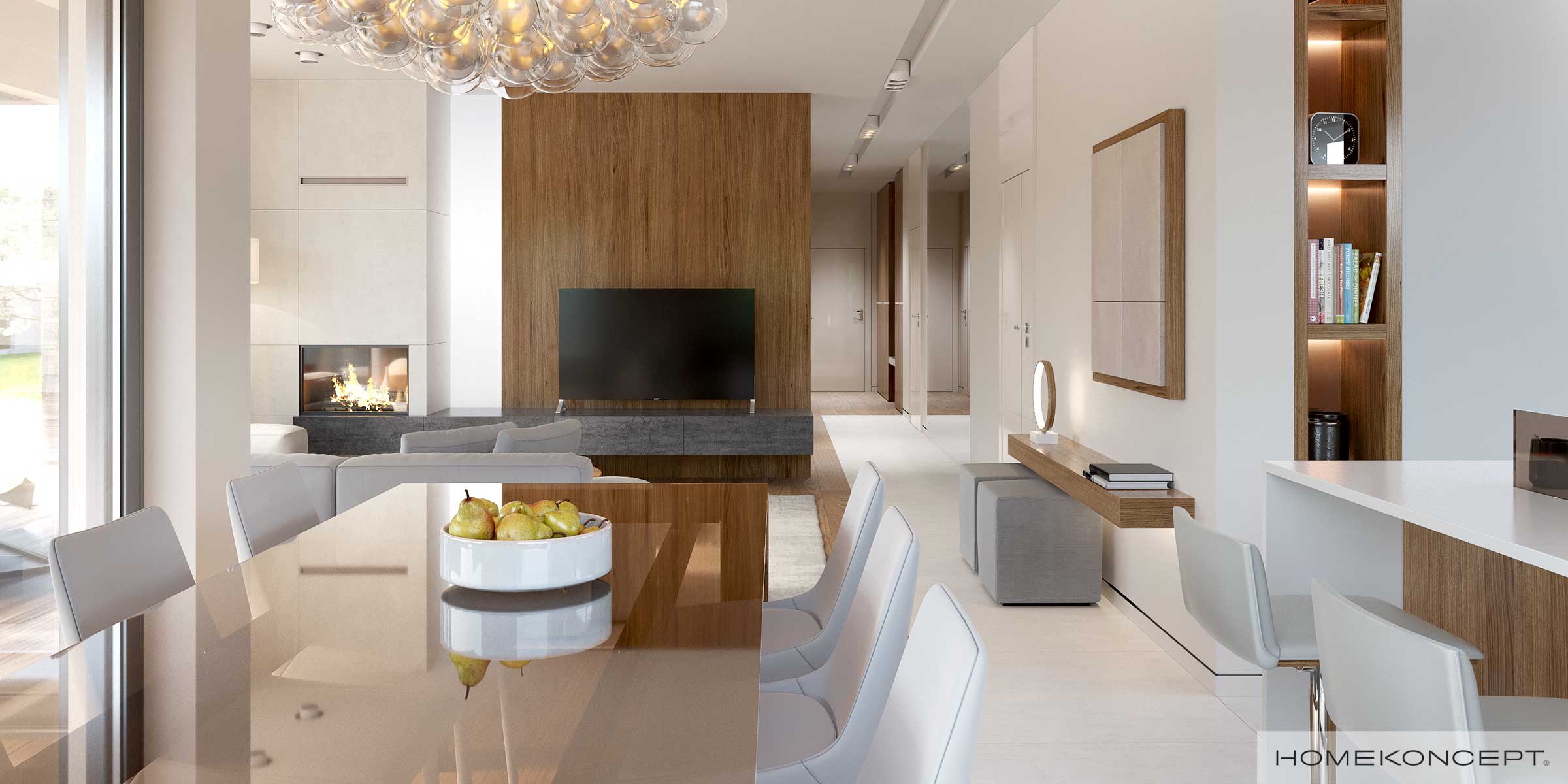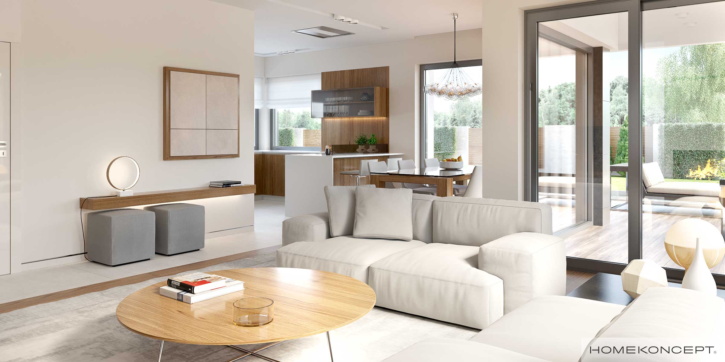 Wnętrze HOMEKONCEPT 36 zostało zaprojektowane z myślą o 4-osobowej rodzinie. Przestronna część dzienna to przede wszystkim jasny salon ze strefą TV i kominkiem oraz jadalnia z wyjściem na taras. Obszerna kuchnia została oddzielona od jadalni praktycznym blatem śniadaniowym. Przy kuchni znajduje się niewielka spiżarnia. W części nocnej do dyspozycji domowników są 3 wygodne sypialnie z wyjściami na taras oraz duża łazienka i dodatkowa toaleta z prysznicem. Układ funkcjonalny domu uzupełnia garaż mieszczący 2 samochody, pomieszczenie gospodarcze oraz obszerna kotłownia gazowa z pralnią. Dom został zaprojektowany w standardzie energooszczędnym.