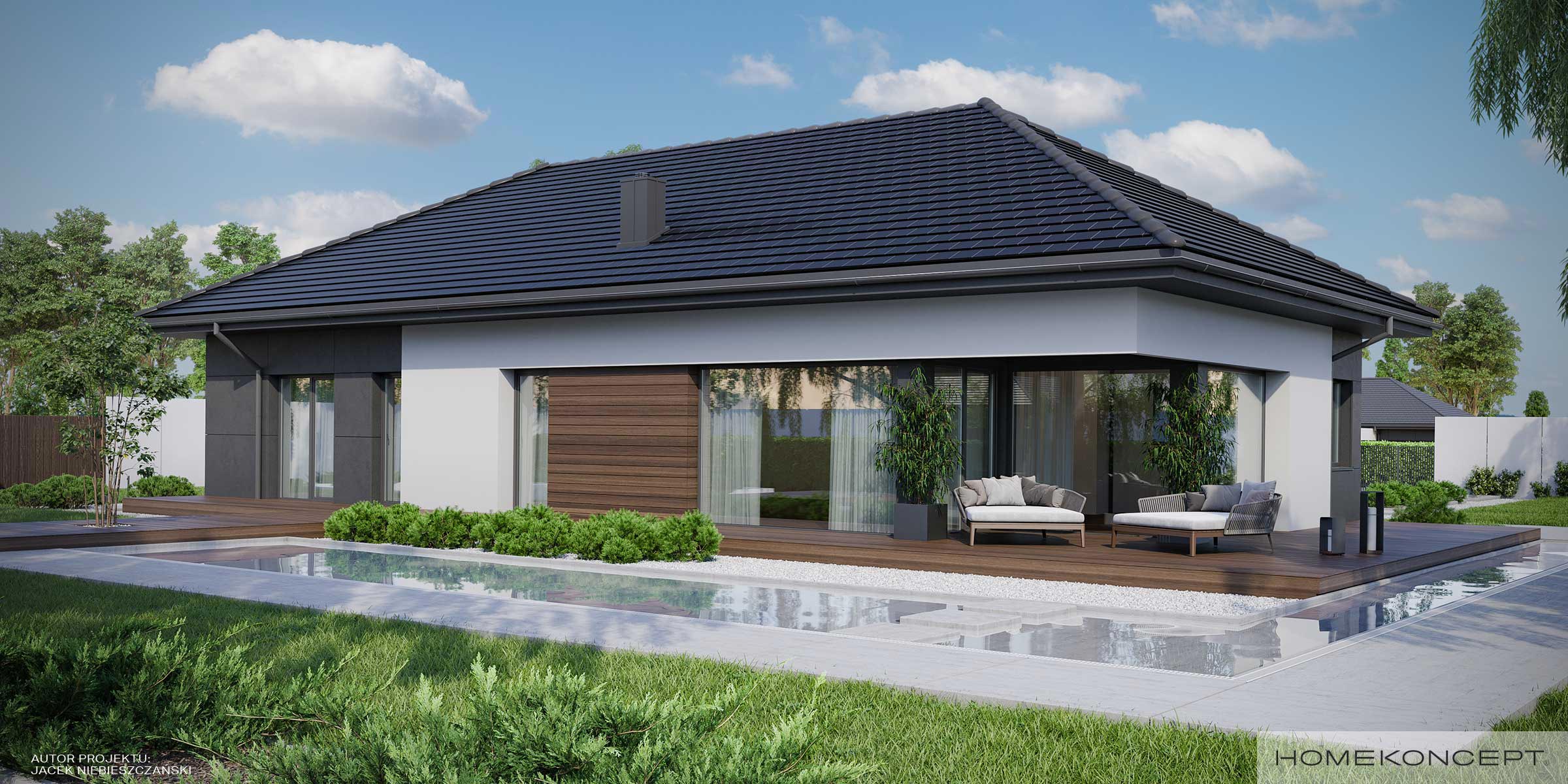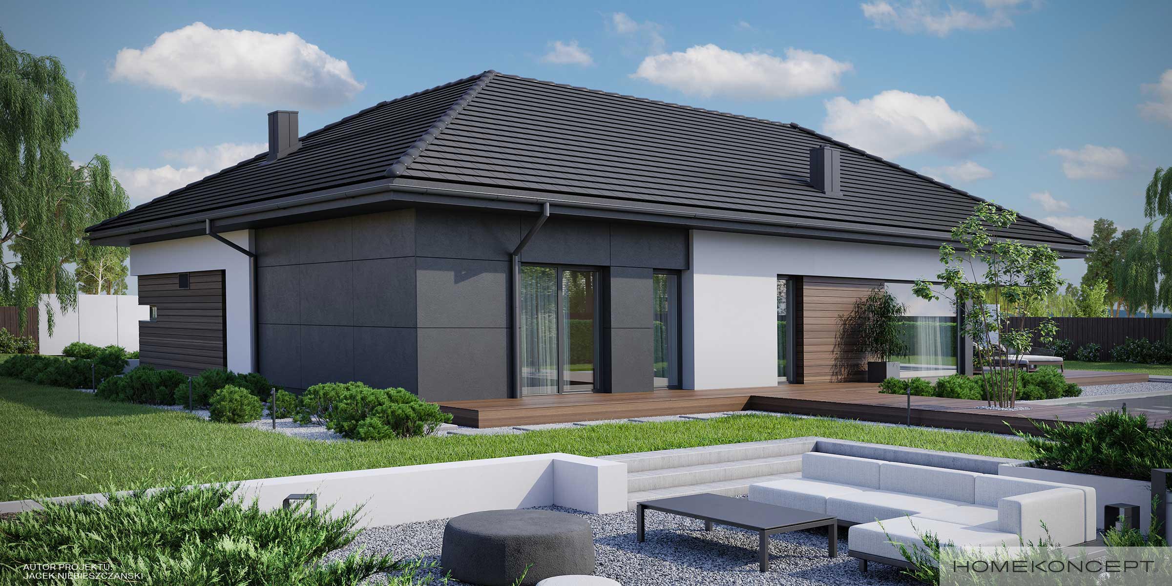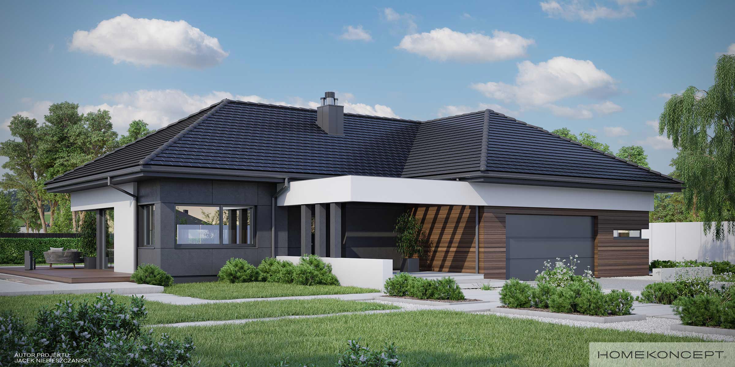 HOMEKONCEPT 36 jest doskonałą propozycją dla osób szukających niewielkiego domu parterowego z nowoczesną aranżacją elewacji oraz wygodnym układem pomieszczeń. Duże przeszklenia części dziennej idealnie doświetlają pomieszczenia i otwierają dom na ogród. Na zewnątrz budynek został wykończony płytami elewacyjnymi, okładziną drewnianą oraz tynkiem. Wejście do budynku zostało ozdobione unikalnym belkowaniem, charakterystycznym dla kolekcji domów parterowych HOMEKONCEPT.