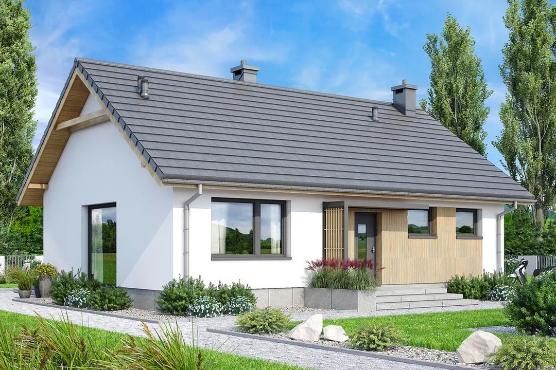Projekt Mirabelka 4 to propozycja małego, energooszczędnego domu parterowego, stworzonego z myślą o osobach szukających ekonomicznego i prostego w realizacji rozwiązania. Dzięki zwartej bryle i klasycznemu układowi funkcjonalnemu, dom jest nie tylko tani w budowie, ale również komfortowy w codziennym użytkowaniu.