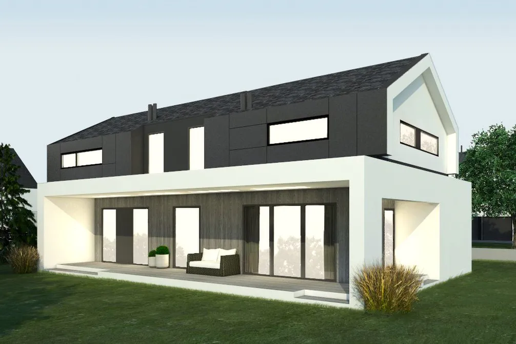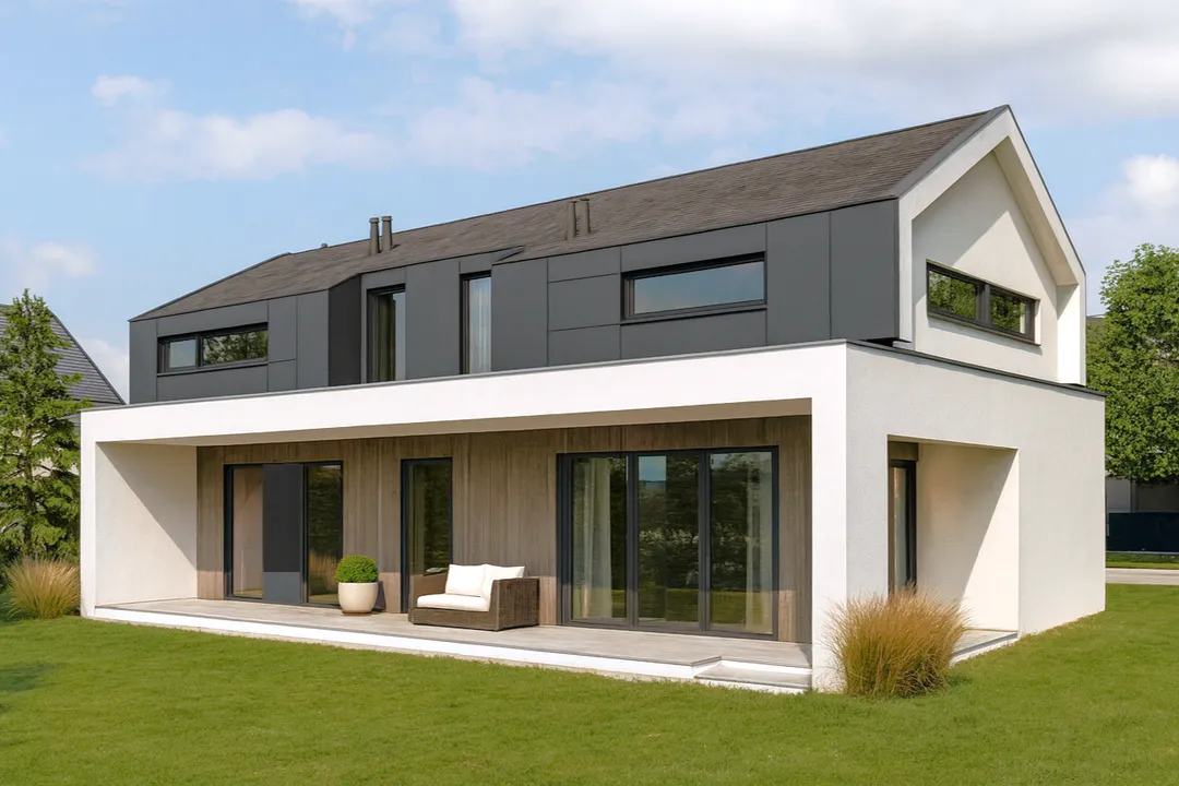 Zastosowanie różnych materiałów elewacyjnych, takich jak tynk, drewno czy płyty elewacyjne, wprowadza wizualną lekkość i nadaje budynkowi dynamicznego charakteru.