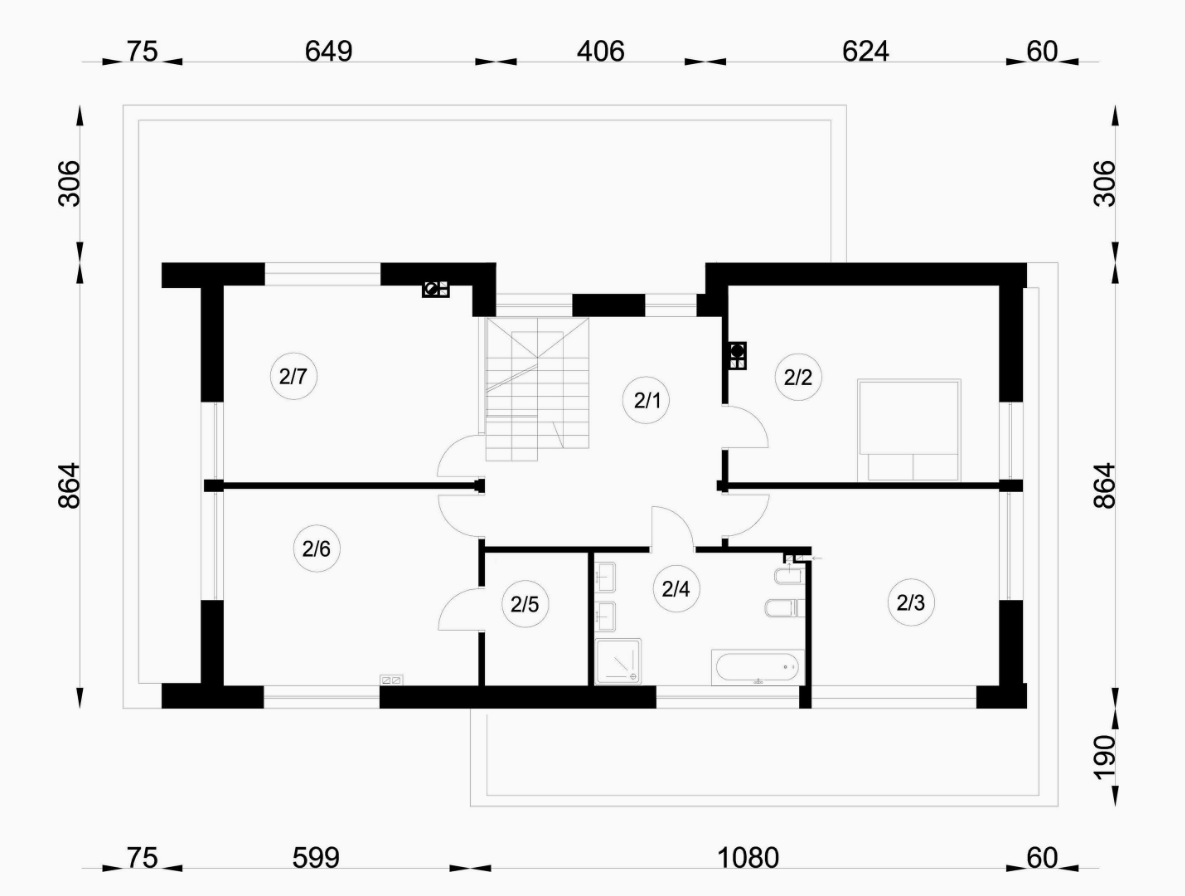 Rzut budynku oparto na układzie centralnym – promieniście rozchodzące się pomieszczenia znacząco ograniczają powierzchnię komunikacyjną, co przekłada się na maksymalną użyteczność przestrzeni mieszkalnej.