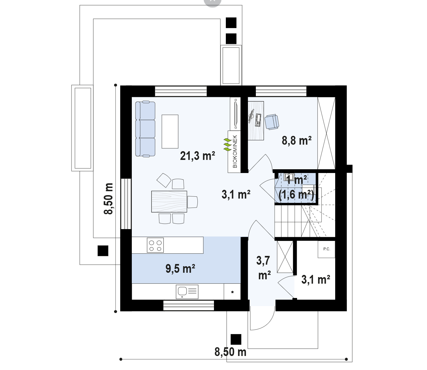 Na parterze znajduje się otwarta kuchnia z klasycznym oknem od strony frontowej. Przestrzeń ta płynnie przechodzi w jadalnię z bezpośrednim wyjściem na taras – idealnym miejscem na posiłki w ciepłe dni. Salon pomieści wygodną kanapę, telewizor oraz nowoczesny biokominek. W przeciwieństwie do tradycyjnych rozwiązań, biokominek nie wymaga kominów, fundamentów ani obróbek dachowych, a przy tym jest przyjazny środowisku – nie emituje dymu ani spalin, ponieważ wykorzystuje ekologiczne paliwa, najczęściej bioetanol.