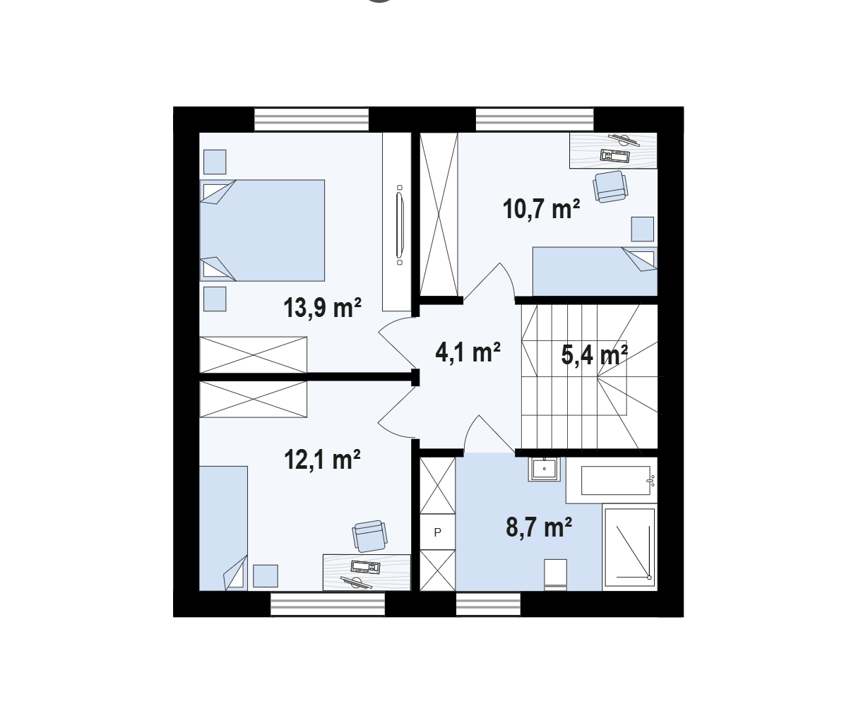 Mimo niewielkiej powierzchni zabudowy (69,2 m²), projekt przewiduje również dodatkowy pokój na parterze, który świetnie sprawdzi się jako domowe biuro, pokój gościnny lub miejsce do nauki. Pod schodami zaplanowano praktyczną łazienkę z WC – wygodne rozwiązanie dla mieszkańców i odwiedzających.