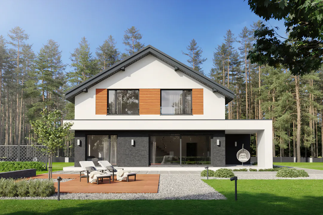 Bryła TWÓRCZEGO D79 to atrakcyjne połączenie prostoty i nowoczesnych detali. Dwuspadowy dach uzupełniają płaskie ramy nadające bryle głębi i nowoczesnego sznytu. Elewację wykończono w jasnym tynku, a strefę parteru ozdobiono klinkierową okładziną. Uzupełnieniem są drewniane akcenty na piętrze, które ocieplają wygląd i tworzą spójną, elegancką kompozycję.